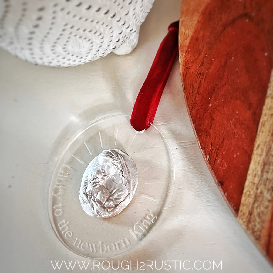This acrylic engraved ornament features a pearly white intaglio of the Blessed Mother kissing baby Jesus. Engraved around the intaglio is, “Glory to the new born King.”