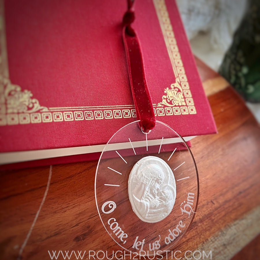 This acrylic engraved ornament features a pearly white intaglio of the Blessed Mother holding baby Jesus. Engraved around the intaglio is, “O come, let us adore Him.”