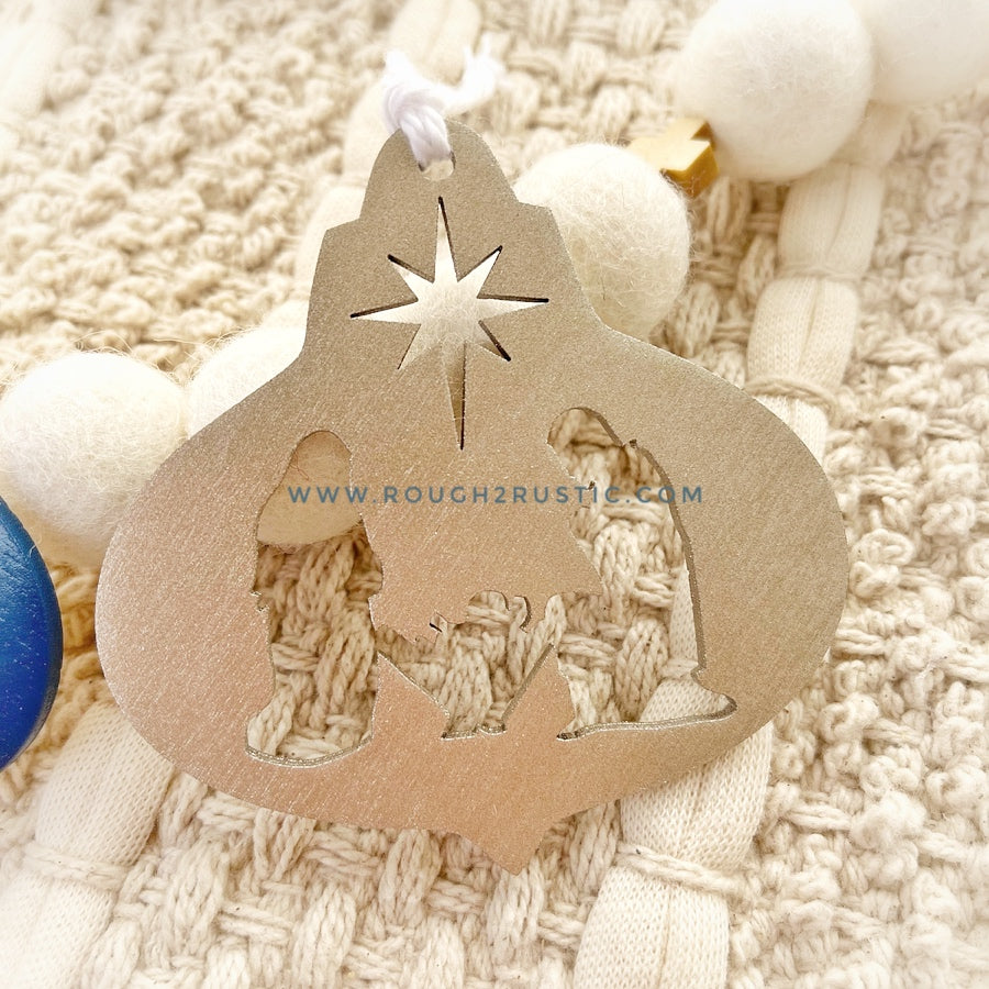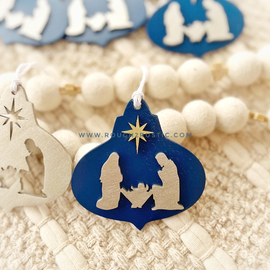The silhouette style ornament is painted a metallic champagne color on both sides. The 3D layered ornament is painted a deep night blue with the metallic gold Star of Bethlehem and metallic champagne Holy Family layered on top.