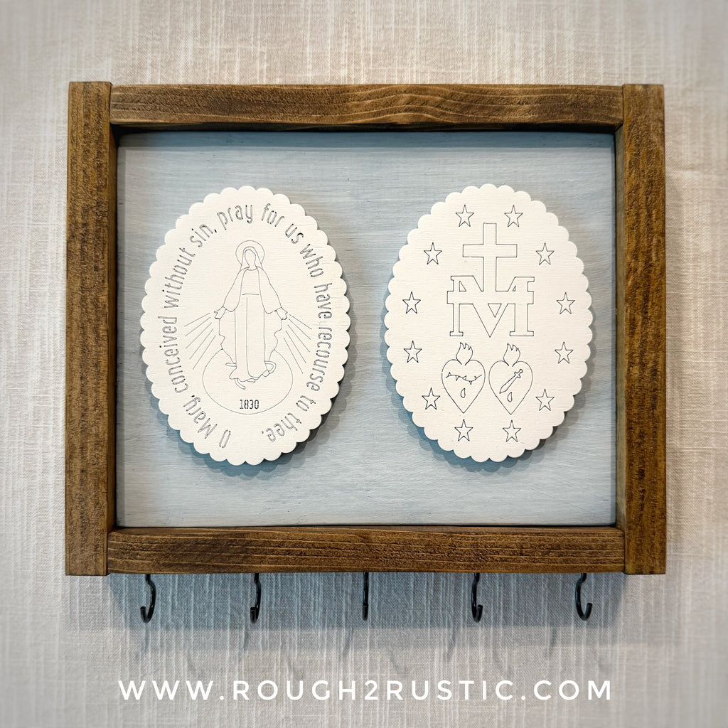 *Engraved Miraculous Medal wood cutouts are painted white and attached to a wood backing finished in our unique blue denim finish (this finish can have a slightly different look based on wood grain). Trim is stained dark brown.