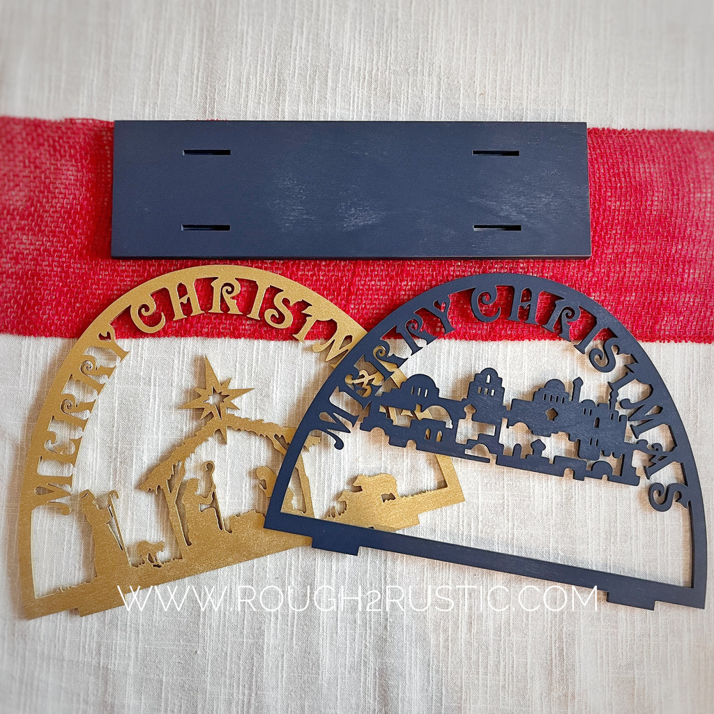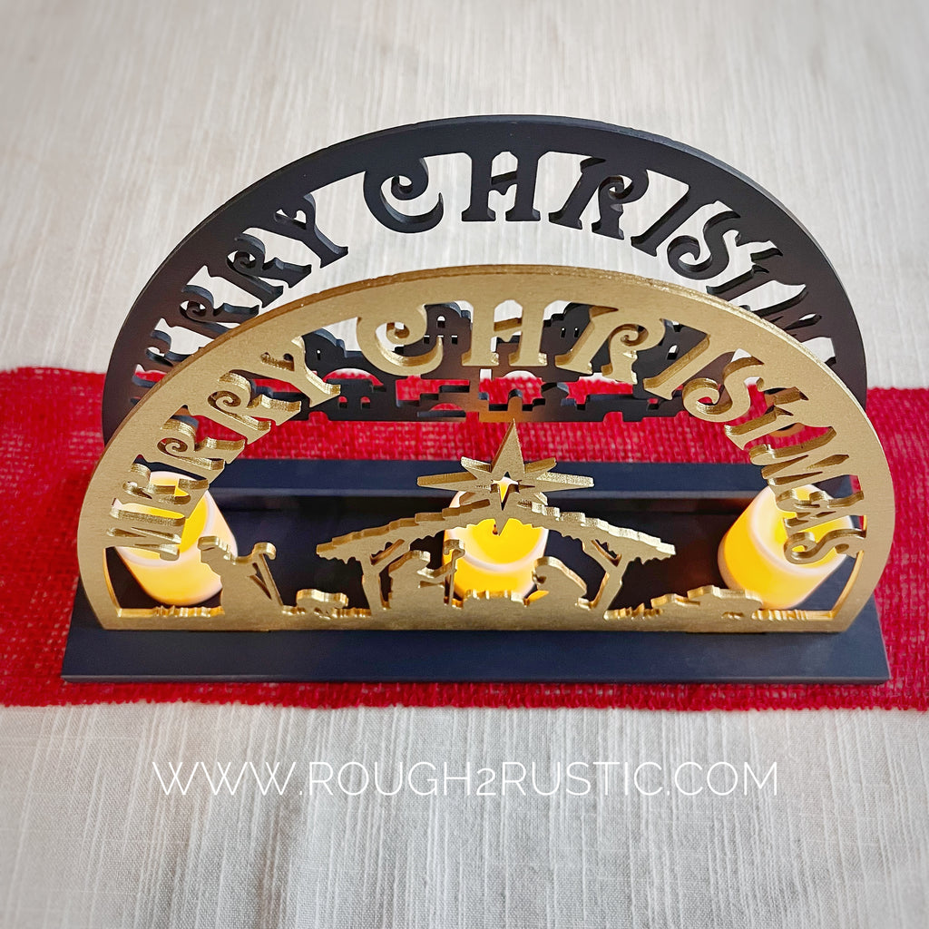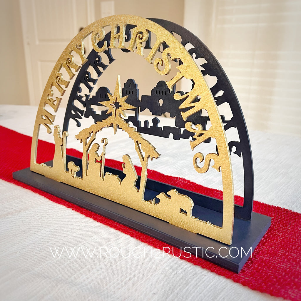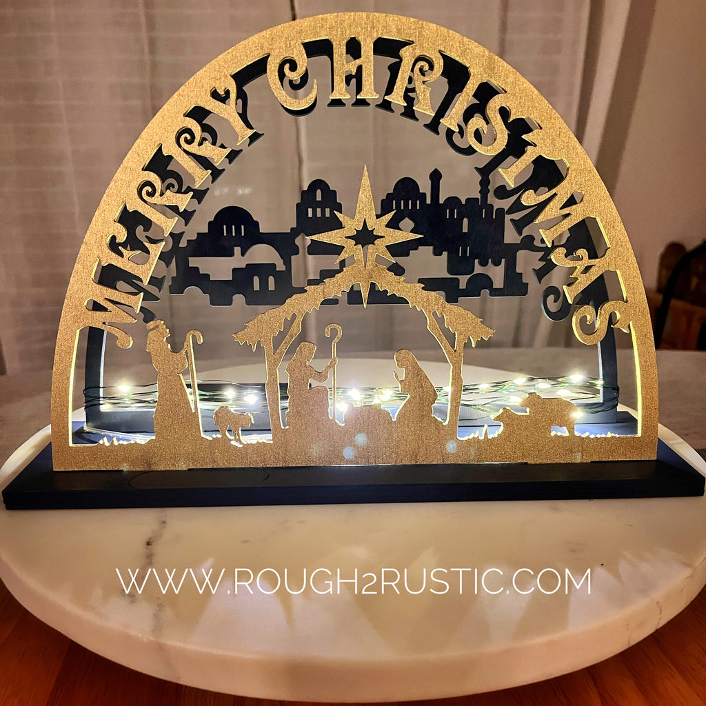 Features two removable pieces and the base. One removable piece has the town of Bethlehem cut out and painted deep navy and one with the stable scene and painted metallic gold. Add some battery-operated lights for a lovely display or night light.