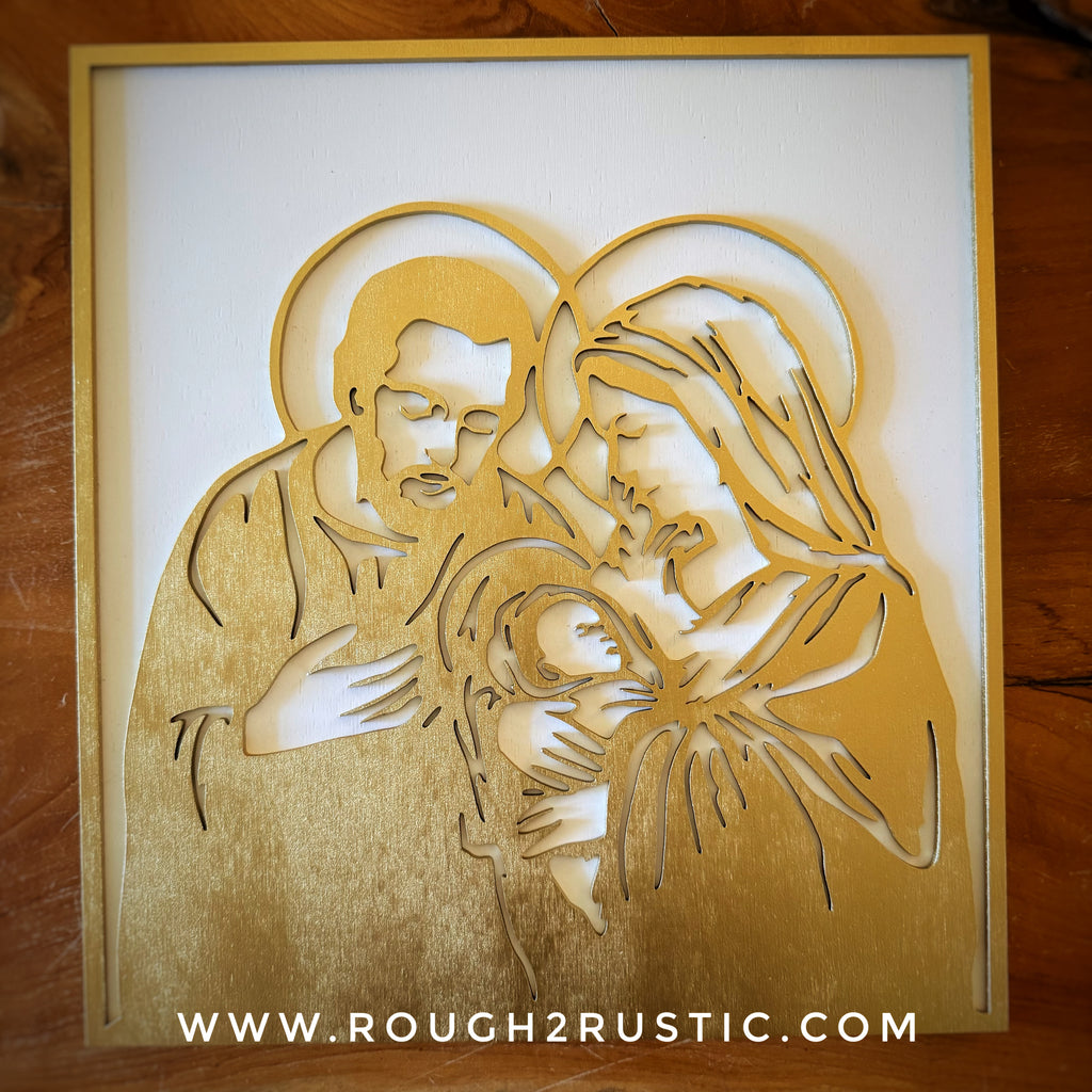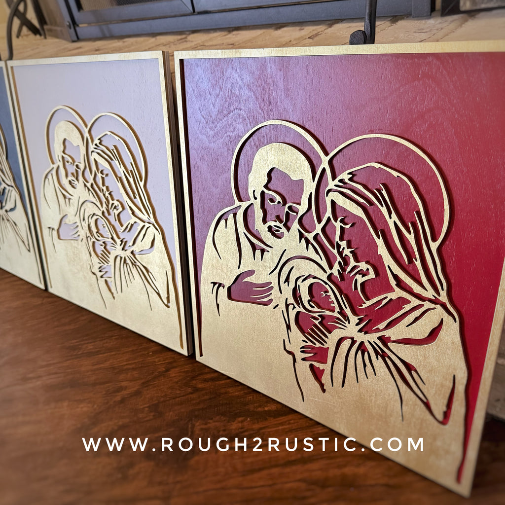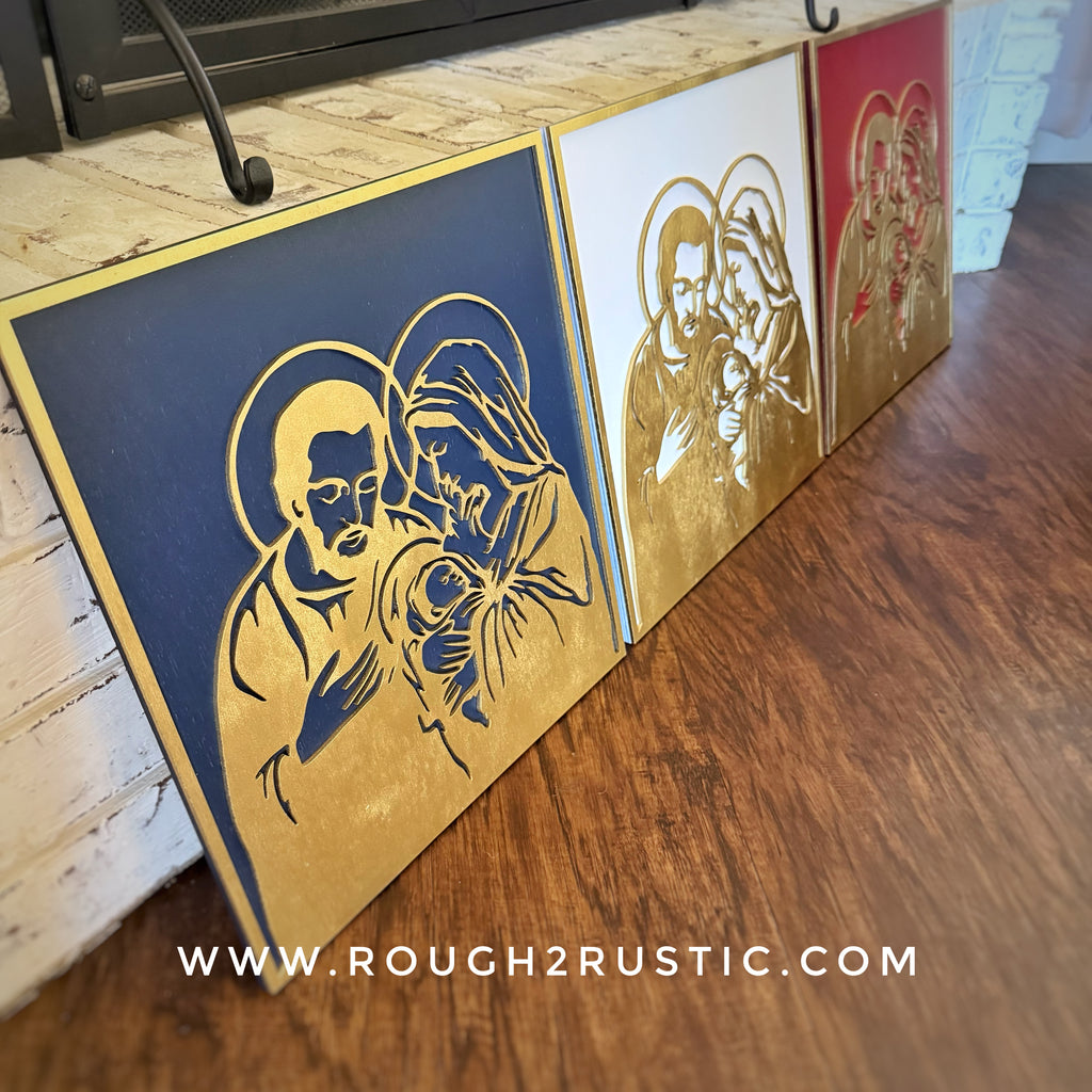 Layered painted wood Nativity Portrait. Now available in three color options…navy/gold, red/gold, and white/gold.