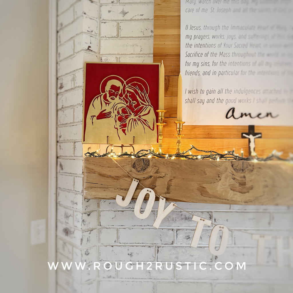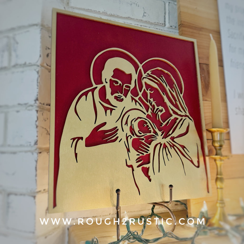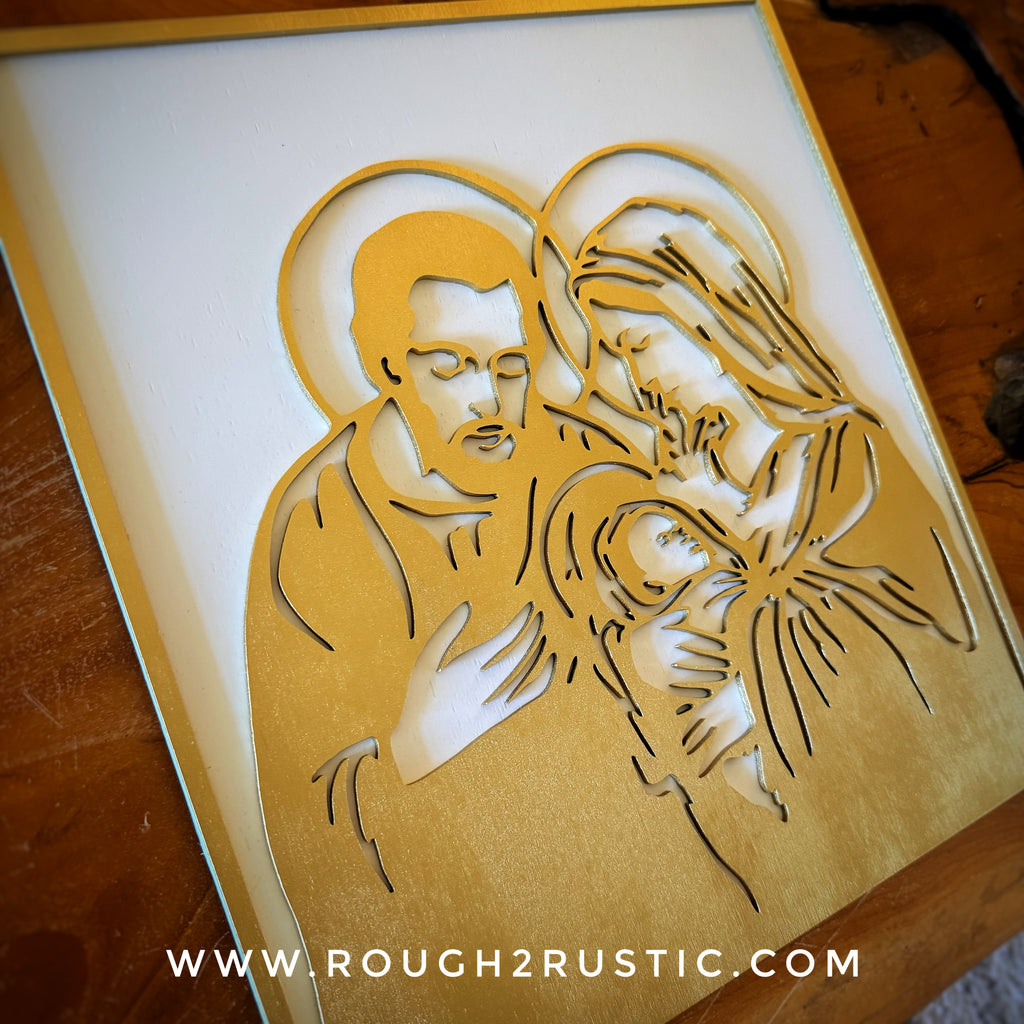 Layered painted wood Nativity Portrait. Now available in three color options…navy/gold, red/gold, and white/gold.