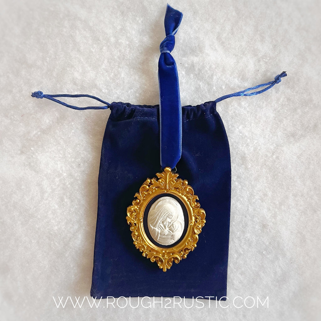 Each intaglio is finished with a shimmery white coat and mounted on a gold frame with navy backing. A beautiful blue velvet ribbon is attached for a classy finish. Each one comes in a soft blue velvet bag.